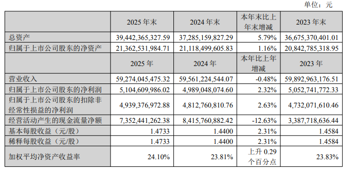 【大河财立方消息】3月24日,双汇发展(000895.SZ)发布2025年年度报告,实现营业收入592.74亿元,同比下降0.48%;归属于上市公司股东的净利润为51.05亿元,同比增长2.32%。