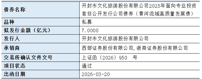 【大河财立方消息】3月24日,开封市文化旅游股份有限公司2025年面向专业投资者非公开发行公司债券(黄河流域高质量发展债)项目获上交所通过。