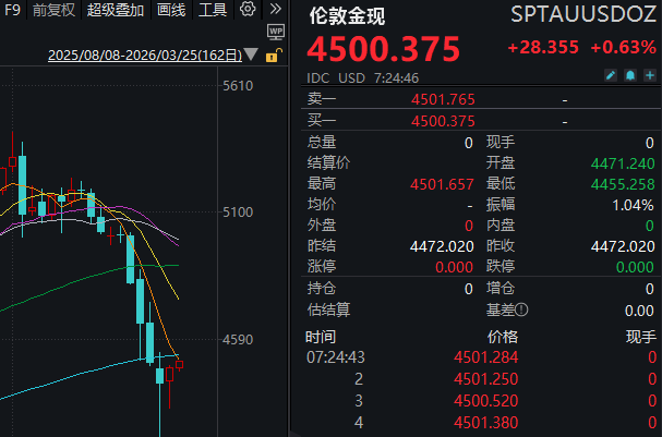 【大河财立方消息】3月25日,现货黄金快速拉升,重回4500美元/盎司,日内涨幅0.63%。