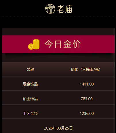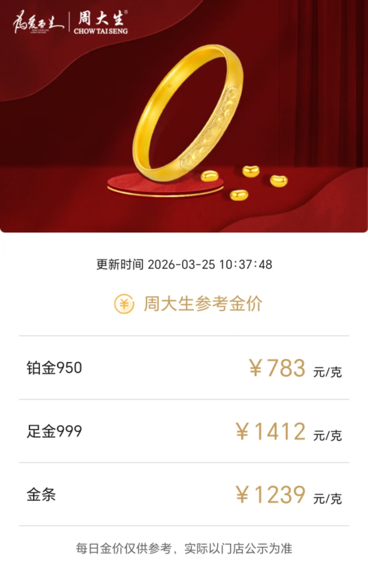 受国际金价上涨影响,国内部分品牌金饰价格同步上调。其中,周生生足金饰品报1418元/克,较前一日上涨68元;老凤祥报价1408/克,单日上涨63元/克;老庙黄金报1411元/克,较前一日上涨66元;周大福、周大生报价1412元/克,较前一日均上涨66元。