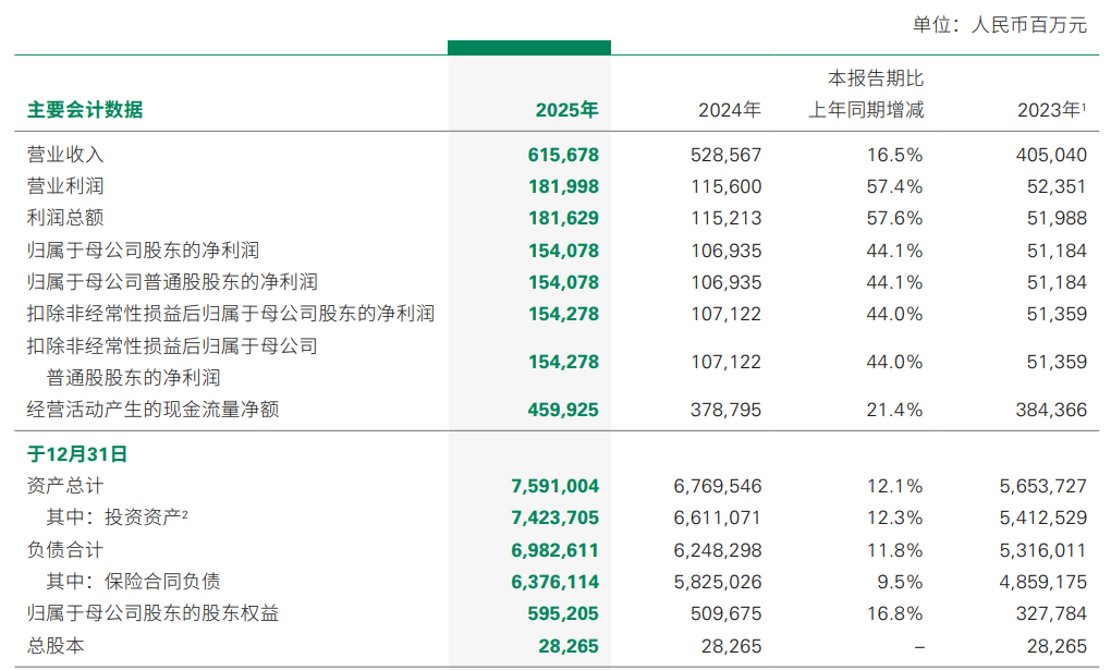 【大河财立方消息】3月25日 ,中国人寿披露2025年年度报告。数据显示,2025年实现营业收入6156.78亿元,同比增长16.5%;净利润1540.78亿元,同比增长44.1%。