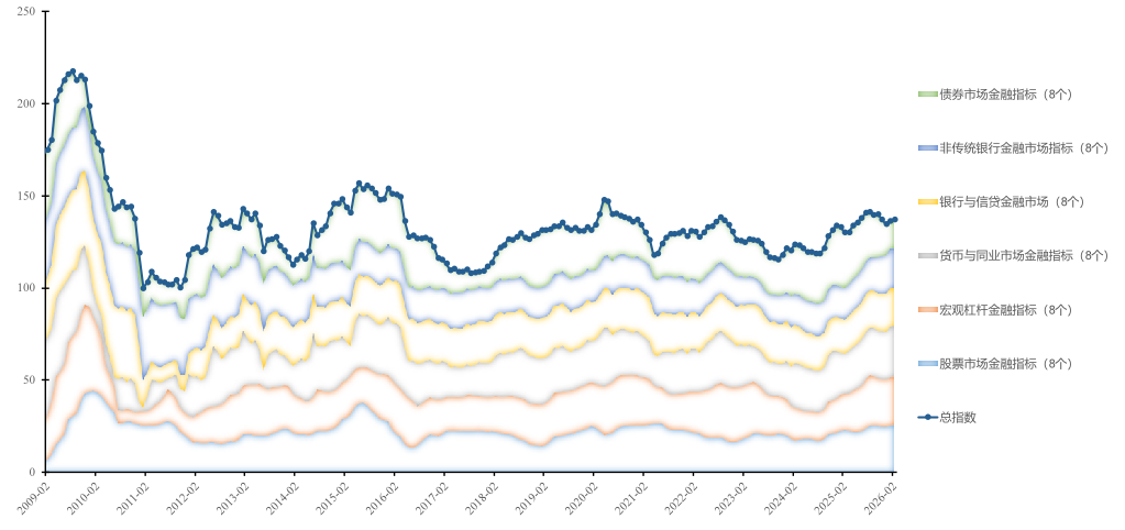 注:图一为分市场指数堆积柱状图,配有总指数拟合线,以2008年1月至2026年2月的最低点(100)为基准。