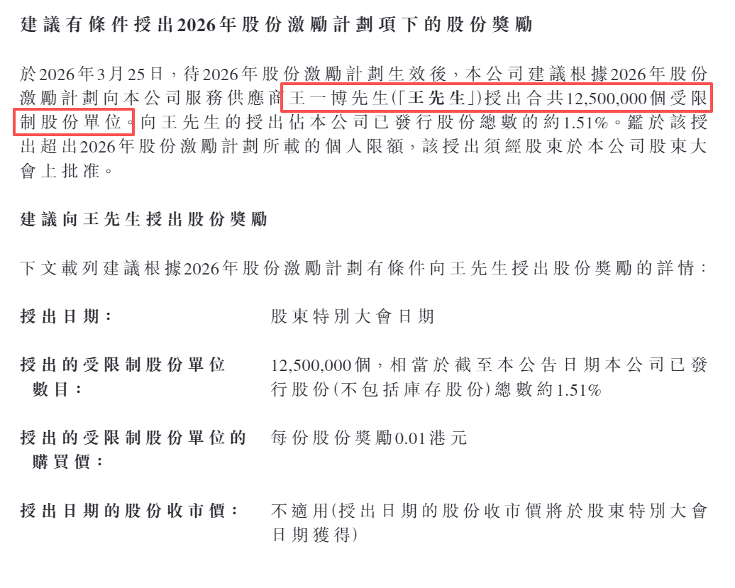 乐华娱乐称,王一博根据与乐华娱乐的艺人服务合同获聘为主要服务供应商,且通过积极参与代言、业务推广活动及其他商业委聘,对公司的商业营运产生巨大价值。建议授出受限制股份单位旨在表彰王一博于演艺、音乐制作方面的专业经验及其社会影响力。