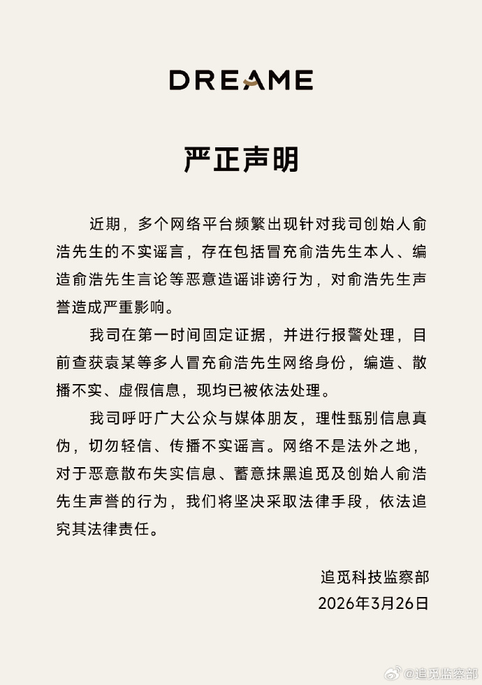 【大河财立方消息】3月26日,追觅科技监察部发布声明称,近期,多个网络平台频繁出现针对公司创始人俞浩的不实谣言,存在包括冒充俞浩本人、编造俞浩言论等恶意造谣诽谤行为,对俞浩声誉造成严重影响。
