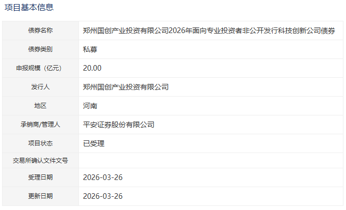 【大河财立方消息】3月27日消息,郑州国创产业投资有限公司2026年面向专业投资者非公开发行科技创新公司债券项目获深交所受理。本期债券拟发行金额20亿元,承销商/管理人为平安证券。