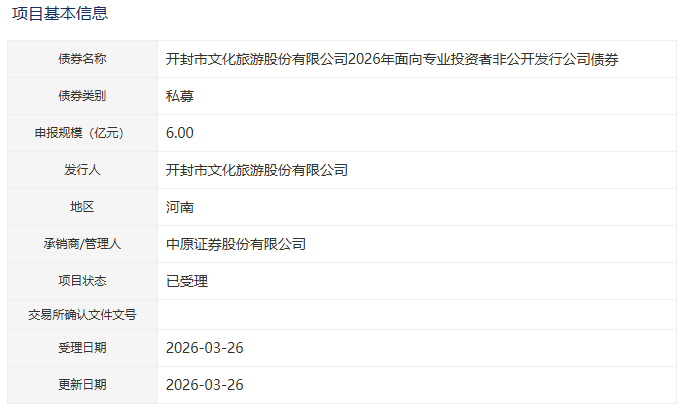 【大河财立方消息】3月27日消息,开封市文化旅游股份有限公司2026年面向专业投资者非公开发行公司债券项目获深交所受理。