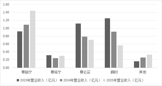 详细来看,赛脑宁销售金额从2023年的0.92亿元增长至2025年的1.44亿元,占主营业务收入比重由24.48%提升至43.01%。同期,赛必妥、瞬时的销售金额及占比则呈现下降趋势,赛络宁虽在2025年有所回升,但尚未恢复至2023年水平。