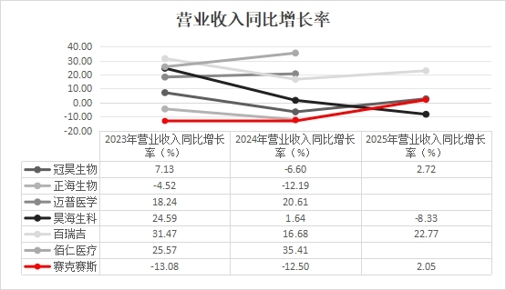 与同行业可比公司相比,赛克赛斯的营收增速处于相对落后位置。2023年及2024年,公司营收增速低于多数可比公司;从复合增长率来看,昊海生物、百瑞吉等企业保持了两位数的年复合增长率,而赛克赛斯近三年营收复合增长率为负值,营收增长承压态势明显。