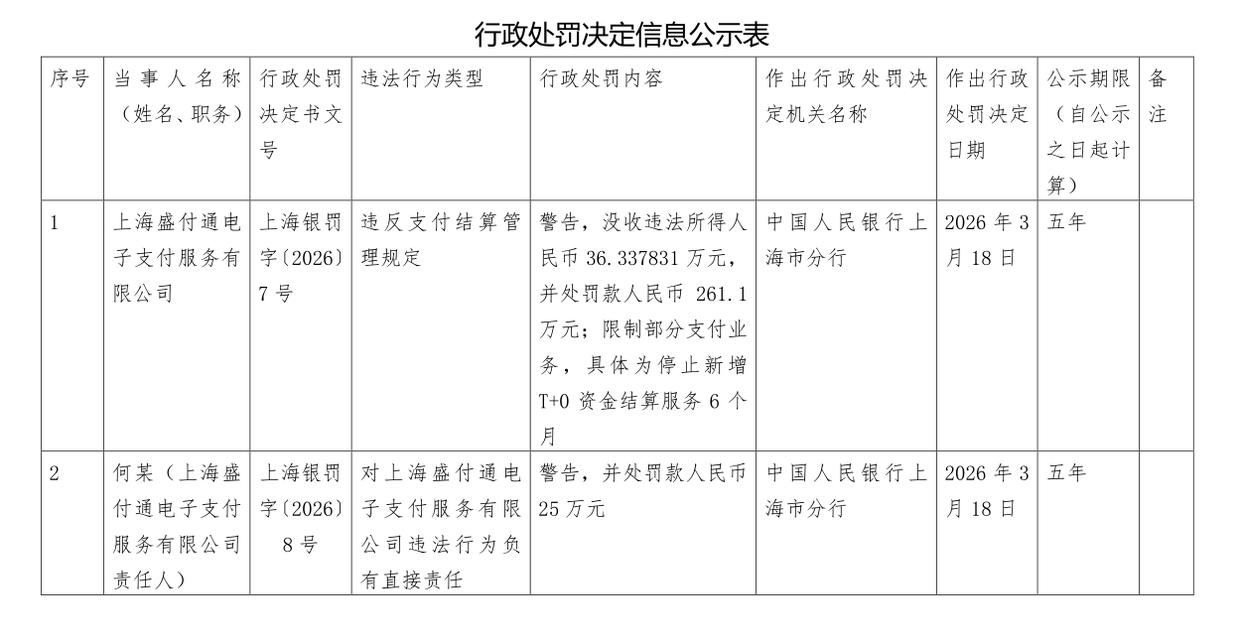 信息公示表显示,上海盛付通电子支付服务有限公司被警告,没收违法所得36.337831万元,并处罚款261.1万元;限制部分支付业务,具体为停止新增T+0资金结算服务6个月。