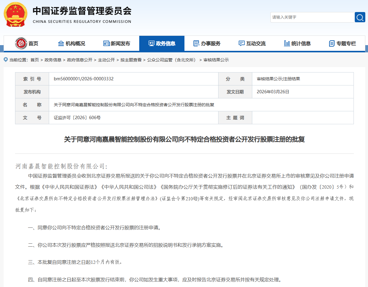 【大河财立方消息】3月27日消息,证监会批复,同意河南嘉晨智能控制股份有限公司向不特定合格投资者公开发行股票的注册申请。
