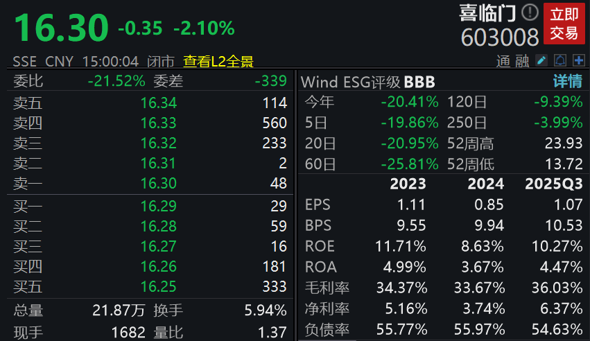 截至3月27日收盘,喜临门报16.3元/股,跌幅为2.1%。