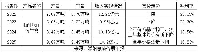 记者梳理发现,2022年至2025年度,其顺酐酸酐衍生物产品的产量从7.02万吨持续增至9.87万吨,销量从6.76万吨持续增至9.49万吨,4年销量增幅超40%。