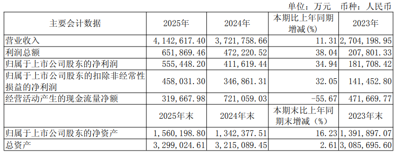 财报显示,2025年,宇通客车全年累计实现客车销售49518辆,同比增长5.54%;实现营业收入414.26亿元,同比增长11.31%;实现归属于上市公司股东的净利润55.54亿元,同比增长34.94%。