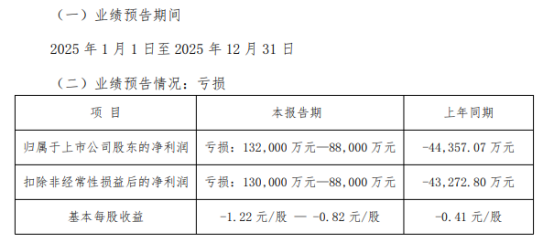 2025年业绩预告显示,报告期内,预计归母净利润亏损8.8亿元至13.2亿元。