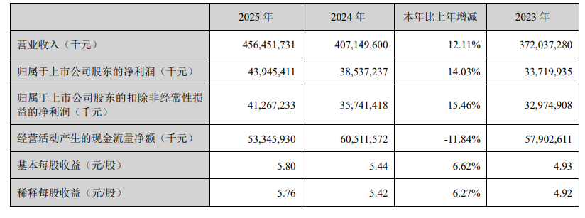 董事会通过利润分配预案,拟向全体股东每10股派发现金38元(含税),合计现金分红总额为285.87亿元,不以公积金转增股本。年度现金分红和股份回购总额合计为439.66亿元,占2025年度合并报表归属于上市公司股东的净利润超 100%。