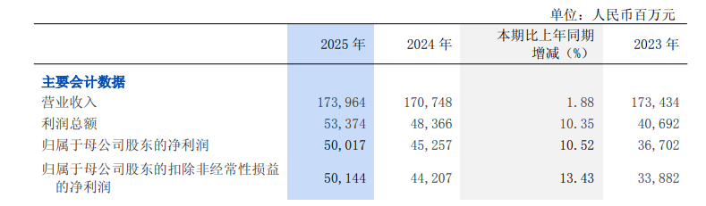 财报显示,2025年,浦发银行实现营业收入1739.64亿元,同比增长1.88%;实现利润总额533.74亿元,同比增长10.35%。归属于母公司股东的净利润500.17亿元,同比增长10.52%,连续两年保持两位数增长。净息差为1.42%,较上年持平;平均总资产收益率(ROA)为0.52%,较上年上升0.02个百分点。