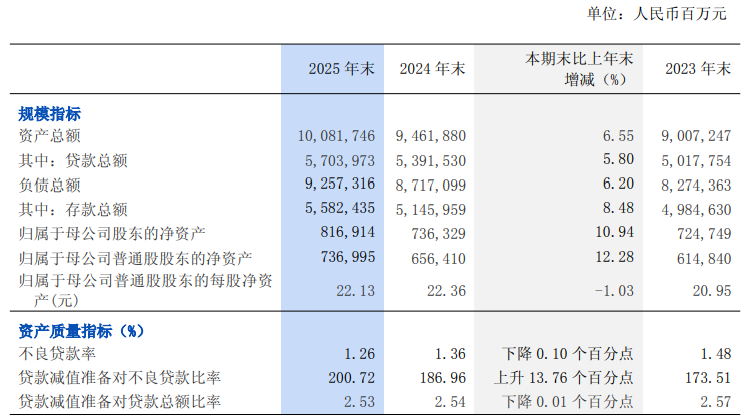 截至2025年末,浦发银行资产总额突破10万亿元,至100817.46亿元,较上年末增加6198.66 亿元,增长6.55%。其中,本外币贷款总额(含票据贴现)为 57039.73 亿元,较上年末增加3124.43 亿元,增长 5.80%。负债总额 92573.16 亿元,较上年末增加5402.17 亿元,增长6.20%;其中,本外币存款总额55824.35 亿元,较上年末增加4364.76 亿元,增长8.48%。