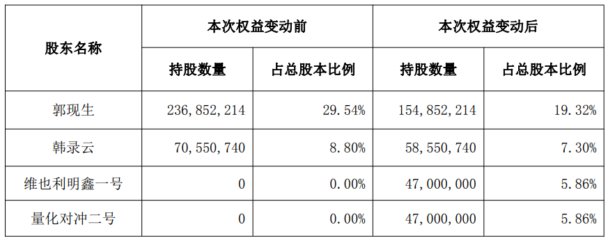 同时,郭现生、韩录云与上海靖戈私募基金管理合伙企业(有限合伙)签署《股份转让协议》,分别将其持有的公司3500万股(占总股本4.3658%)无限售流通股、1200万股(占总股本1.4969%)无限售流通股转让给量化对冲二号。