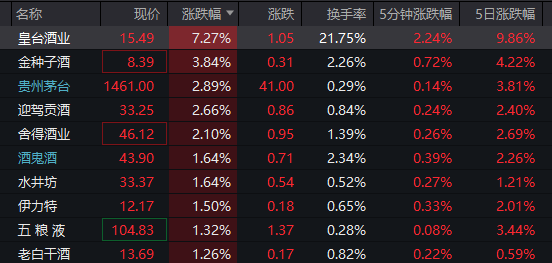 白酒概念反弹,贵州茅台等多只个股跳空上涨。皇台酒业涨停后开板,金种子酒、迎驾贡酒、舍得酒业、水井坊等领涨。