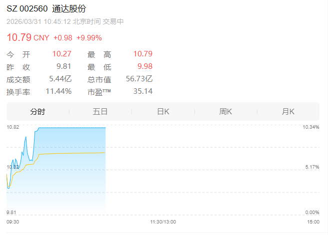 河南板块中,除了宇通客车,通达股份亦表现亮眼,开盘不久拉升涨停。消息面上,通达股份3月30日公布年报称,公司2025年实现营业总收入79.99亿元,同比去年增长29.00%,归母净利润为1.61亿元,同比去年增长533.17%。