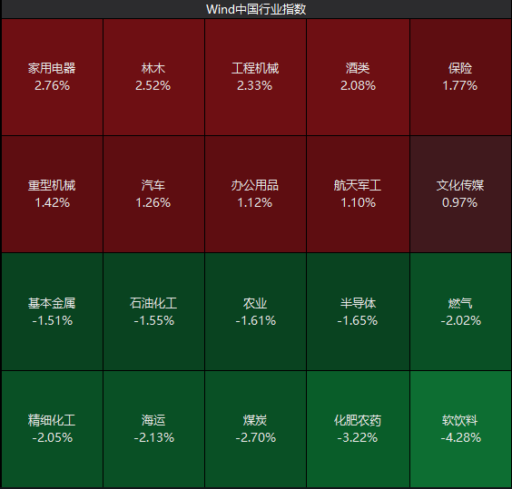 工程机械、家用电器、商业航天、汽车整车、医疗服务、酒类等概念涨幅居前;软饮料、化肥农药、煤炭、燃气、锂矿、石油化工等概念跌幅居前。