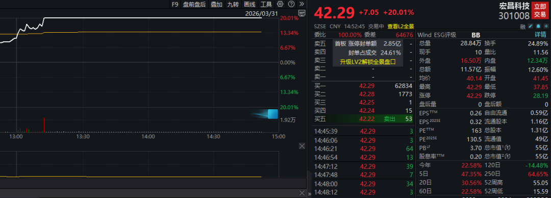 【大河财立方消息】3月31日,张雪机车一战封神消息持续刷屏,其背后的投资方宏昌科技(301008)午后持续拉升,走出2连板,封涨停额为2.85亿元,总市值55亿元。