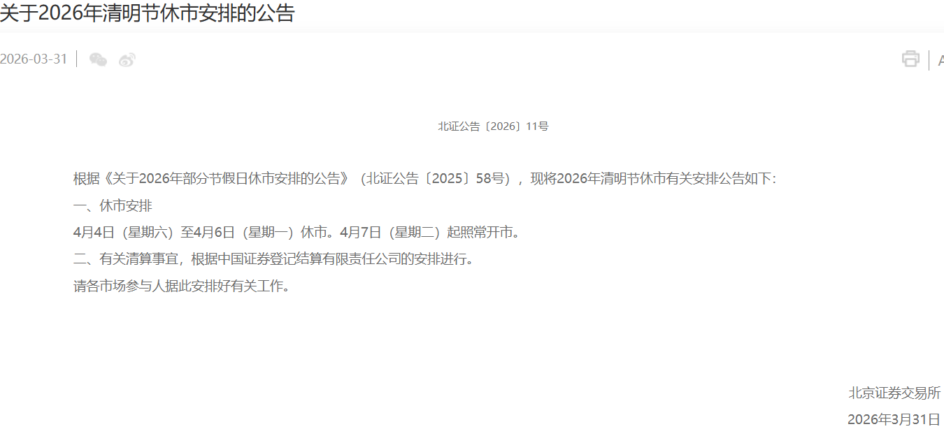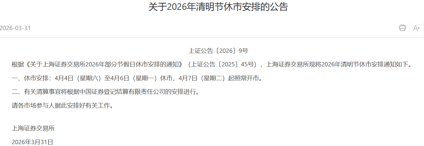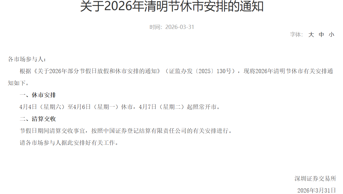 【大河财立方消息】3月31日,上交所、深交所、北交所发布关于2026年清明节休市安排的公告。沪深北交易所将于4月4日(星期六)至4月6日(星期一)休市,4月7日(星期二)起照常开市。