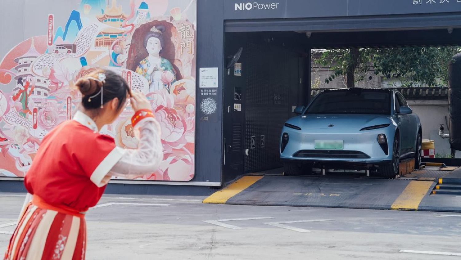 针对新能源自驾游的激增需求,服务区升级配置了62座充电桩,包含500千瓦超充设备,可同时为多辆车快速补能。现场有专人引导,减少了排队等待时间。在服务区东西两侧,两座蔚来换电站也换上了彩绘“新装”,邀请车主创作的“一古一今”主题彩绘,古风一侧描绘丝路驼铃、牡丹画卷;赛博一侧呈现科技洛阳、硬核智造。