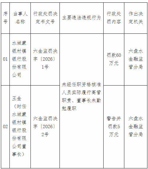 【大河财立方消息】3月31日,国家金融监督管理总局六盘水监管分局披露的行政处罚信息显示,因未经任职资格核准人员实际履行高管职责、董事长未勤勉履职,水城蒙银村镇银行被罚60万元,时任该行董事长王金被警告并罚款5万元。