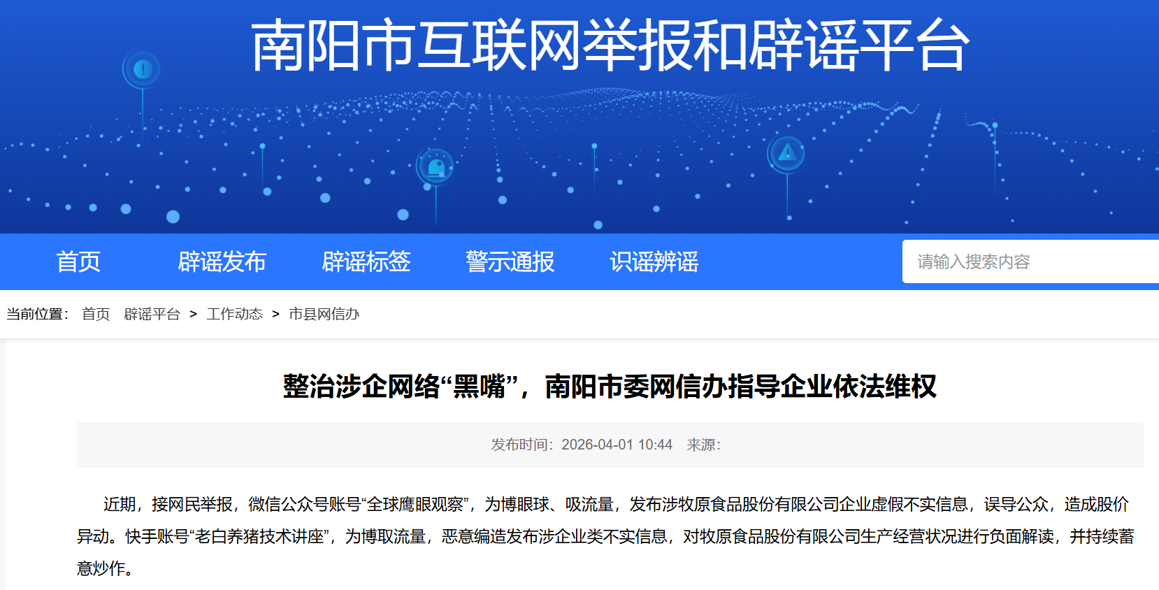 【大河财立方消息】4月1日,南阳市互联网举报和辟谣平台披露,近期,接网民举报,微信公众号账号“全球鹰眼观察”,为博眼球、吸流量,发布涉牧原食品股份有限公司企业虚假不实信息,误导公众,造成股价异动。快手账号“老白养猪技术讲座”,为博取流量,恶意编造发布涉企业类不实信息,对牧原食品股份有限公司生产经营状况进行负面解读,并持续蓄意炒作。