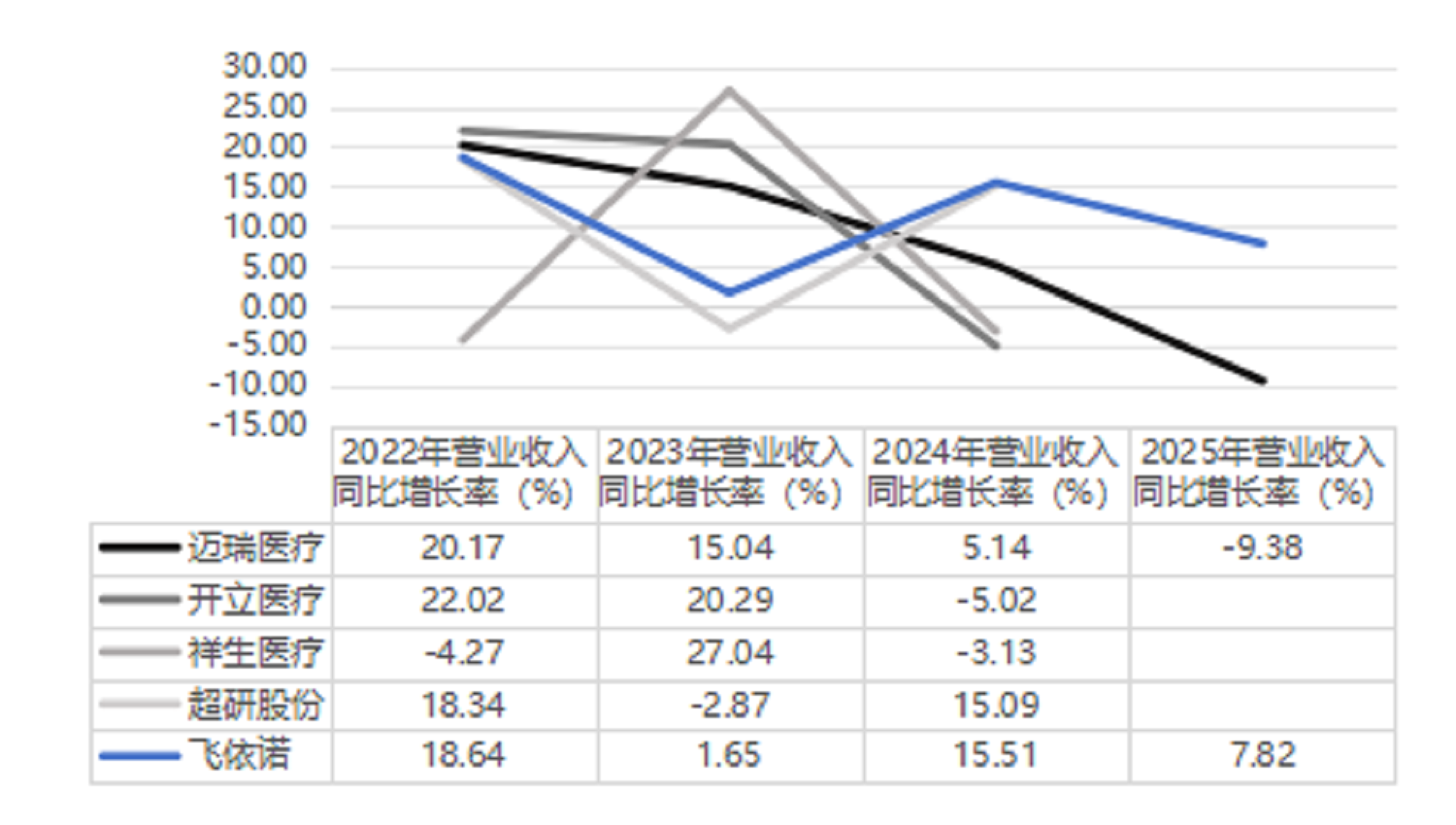 成长能力来看,和同行业可比公司相比,飞依诺已逐步补齐差距,营收同比增长率追平主流步伐。