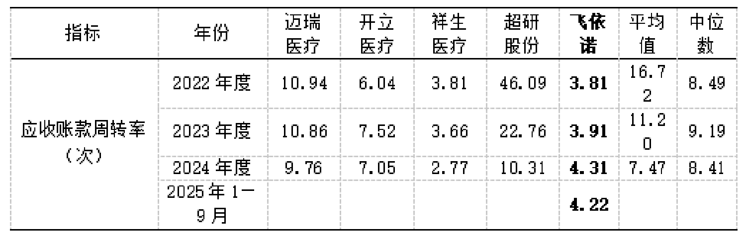 和同行业上市公司相比,飞依诺应收账款周转率显著偏低。2022—2024年,飞依诺的应收账款周转率分别为3.81次、3.91次和4.31次,2025年1—9月为4.22次,虽整体呈现上升态势,但与同行业相比,飞依诺回款周期长、资金占用居高的现象依然存在。