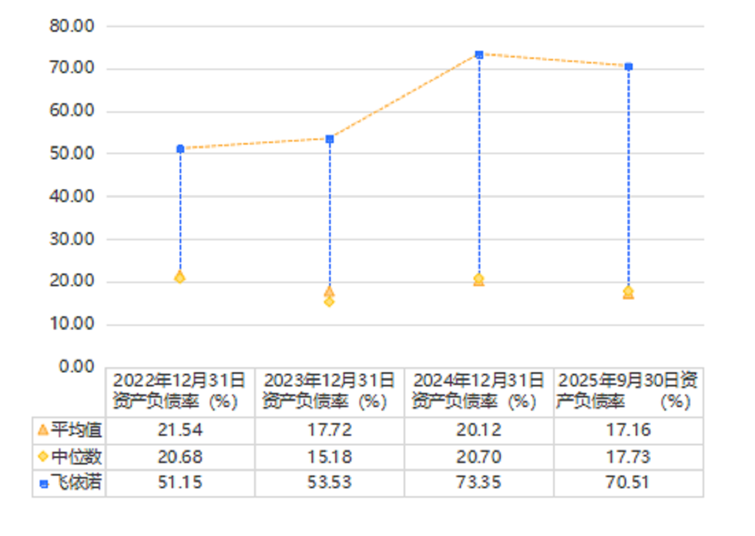 近年来,飞依诺的资产负债率显著高于同行,且整体持续走高。2022年和2023年,飞依诺的资产负债率约在50%左右,2024年资产负债率大幅上升至73.35%,2025年9月30日,飞依诺的资产负债率依然居高不下,超过70%,远高于同行业平均值。