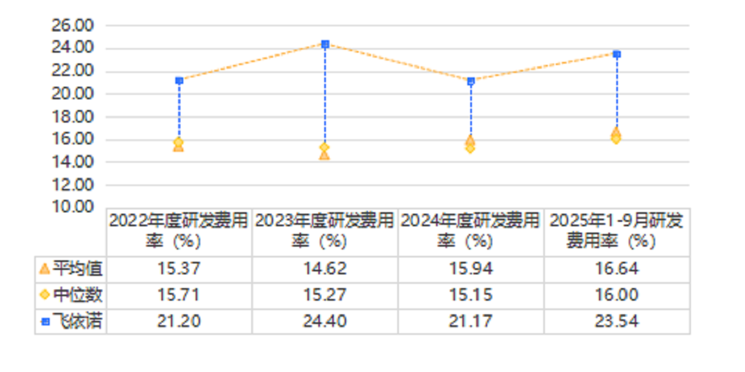 与同行业相比,飞依诺的研发费用率显著高于同行业上市公司平均值,且保持稳定态势。2022—2024年及2025年1—9月,飞依诺研发费用率均高于20%,高于迈瑞医疗、祥生医疗和超研股份,与开立医疗较为接近。