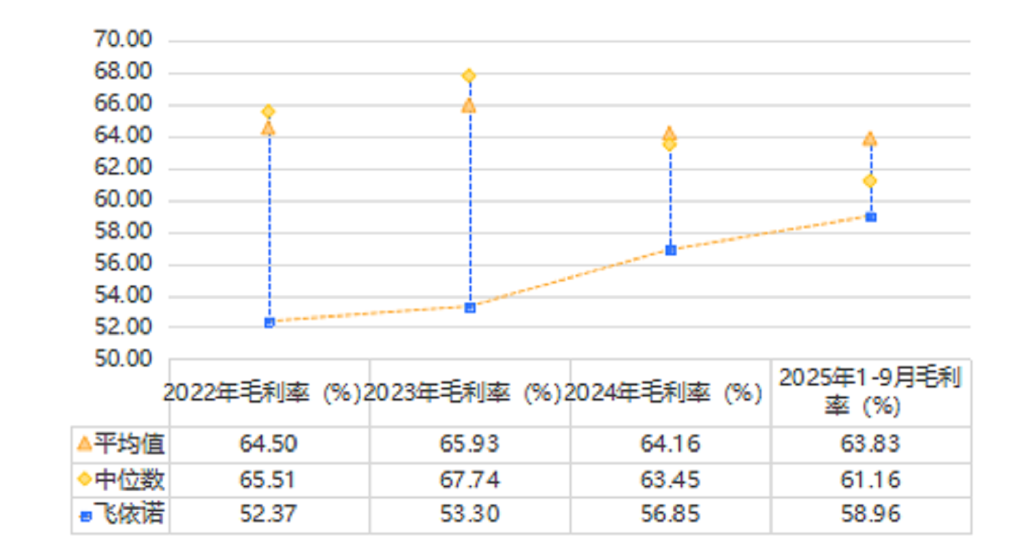 尽管营收端表现良好,飞依诺毛利率水平却显著低于同行。随着公司高毛利率新机型的不断推出、持续的成本优化以及探头等核心部件自产率不断提升,飞依诺的毛利率不断攀升。2022—2024年及2025年1—9月,公司毛利率均站稳50%以上区间,不过仍未突破60%的行业平均门槛,与同业企业存在明显差距,高端产品盈利溢价、核心技术利润释放空间仍有较大提升潜力。