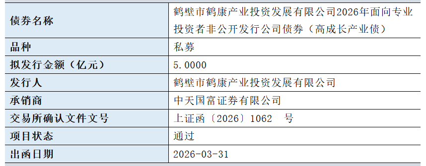 【大河财立方消息】4月1日,鹤壁市鹤康产业投资发展有限公司2026年面向专业投资者非公开发行公司债券(高成长产业债)项目,获上交所通过。