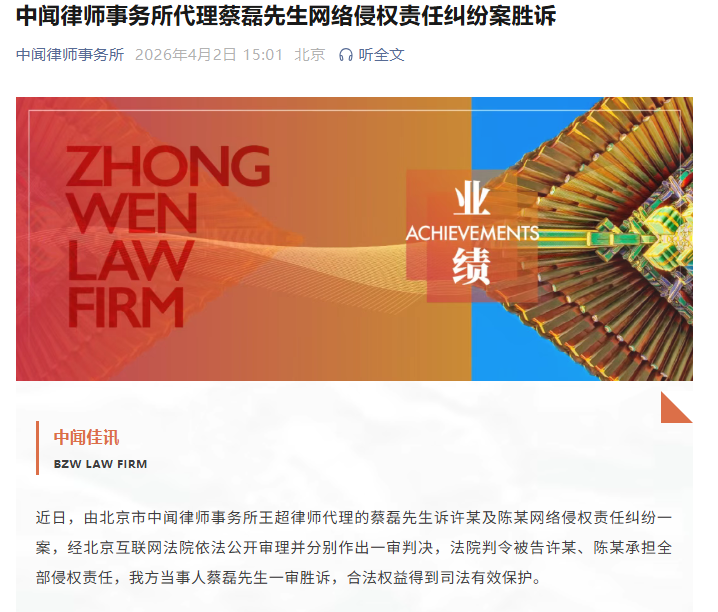 【大河财立方消息】4月2日,北京市中闻律师事务所发文称,由该所律师代理的蔡磊诉许某及陈某网络侵权责任纠纷一案,经北京互联网法院依法公开审理并分别作出一审判决,法院判令被告许某、陈某承担全部侵权责任,蔡磊一审胜诉。