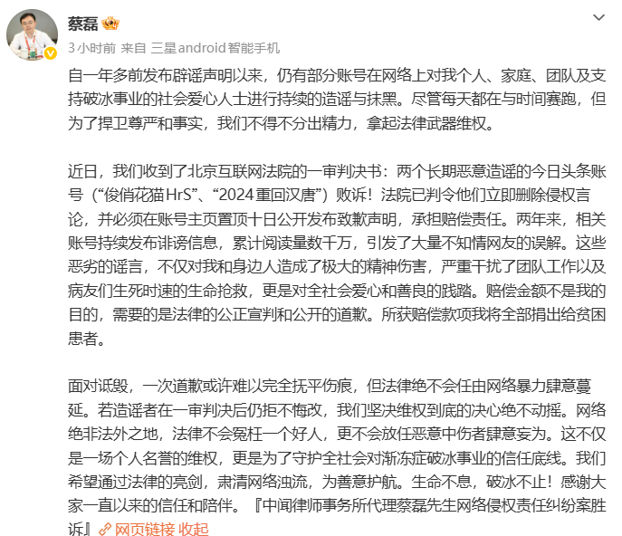 随后,蔡磊本人账号转发了上述文章,并表示“两年来,相关账号持续发布诽谤信息,累计阅读量数千万,引发了大量不知情网友的误解。这些恶劣的谣言,不仅对我和身边人造成了极大的精神伤害,严重干扰了团队工作以及病友们生死时速的生命抢救,更是对全社会爱心和善良的践踏。赔偿金额不是我的目的,需要的是法律的公正宣判和公开的道歉。所获赔偿款项我将全部捐出给贫困患者。”