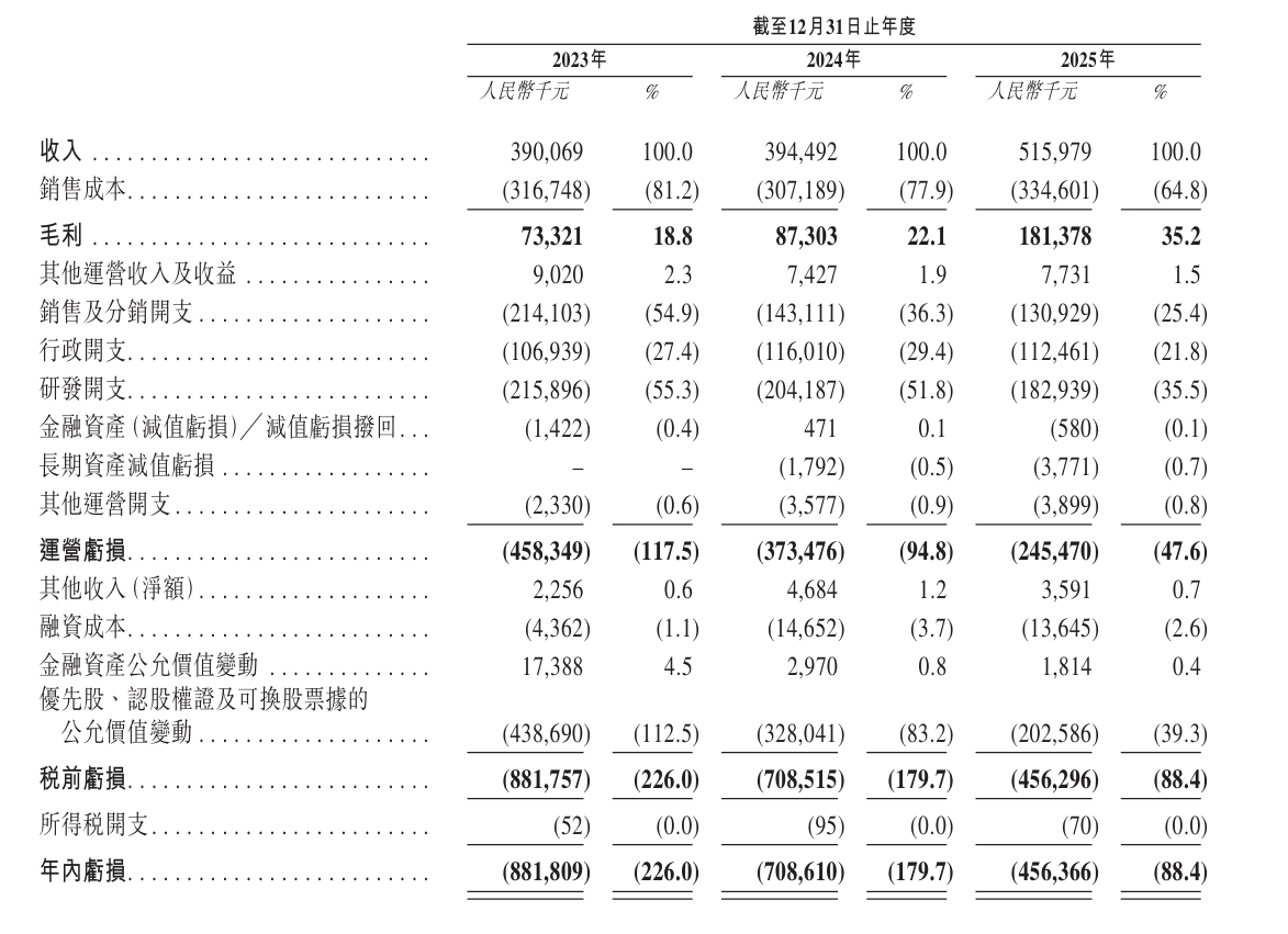 不过,公司目前尚未实现盈利。净亏损从2023年的8.82亿元收窄至2025年的4.56亿元,三年累计减亏近半。公司表示,亏损主要源于优先股、认股权证及可转换票据公允价值变动,核心技术研发投入,以及全球市场教育、渠道建设的销售开支。