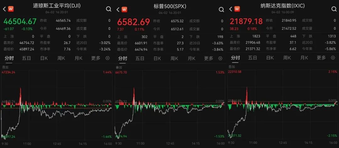 【大河财立方消息】当地时间4月2日,美股上演盘中大逆转。纽约三大股指大幅低开,多个板块持续巨震,纳指一度跌超2%,随后三大指数同步拉升,标普500指数、纳指翻红。截至收盘,道指跌0.13%,标普500指数涨0.11%,纳指涨0.18%。