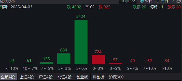 【大河财立方消息】4月3日,A股高开回落,10时左右,沪指再度失守3900点。煤炭、油气、化工、农业等方向跌幅居前,全市场超4500股飘绿。