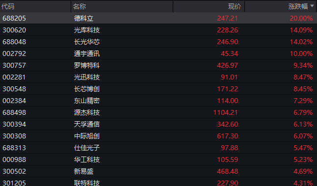 CPO概念再度爆发,德科立、通宇通讯涨停,长光华芯、光库科技、罗博特科等跟涨。龙头股中际旭创、新易盛、天孚通信(“易中天”)集体大涨,成交额盘中一度位居A股前三。