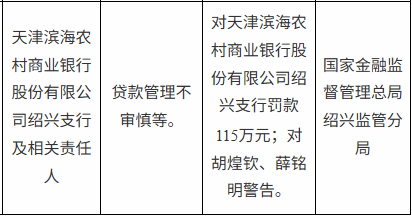 【大河财立方消息】4月3日,国家金融监督管理总局绍兴监管分局披露的行政处罚信息显示,因贷款管理不审慎等,天津滨海农村商业银行绍兴支行被罚115万元,相关责任人胡煌钦、薛铭明被警告。