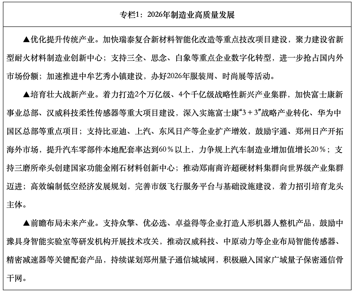 一是加快制造业高质量发展。聚焦国家新型工业化示范区建设,深度对接国家新一轮重点产业链高质量发展行动,优化重点产业链群培育机制。着力推进龙头企业扩张、高成长企业跃升、专精特新企业提质、重点工业产品出海等重点任务,力争新增规上工业企业250家、制造业单项冠军企业1家以上、百亿级工业企业2家。持续实施“一县一主链”行动,争取新培育5个省级以上产业集群,巩固提升2个国家级战略性新兴产业集群和2个中小企业特色产业集群。深入实施传统汽车、装备制造、铝工业、食品制造、服装家居、耐材建材等传统产业提质升级行动,焕发传统产业新优势。加大对新一代信息技术、新能源、高端装备、超硬材料、智能传感器等战略性新兴产业支持,整车产量突破150万辆、新能源汽车产量突破100万辆。聚焦具身智能、氢能与新型储能、生物制造、量子科技、新一代信息网络等重点领域,提速建设5个省级未来产业先导区,全年建设未来产业特色园区15个以上,力争未来产业规模达2500亿元。