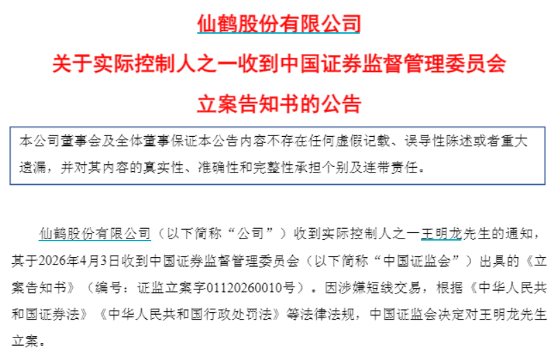 仙鹤股份收到实际控制人之一王明龙的通知,其于2026年4月3日收到中国证监会出具的《立案告知书》(编号:证监立案字01120260010号)。因涉嫌短线交易,根据《中华人民共和国证券法》《中华人民共和国行政处罚法》等法律法规,中国证监会决定对王明龙立案。