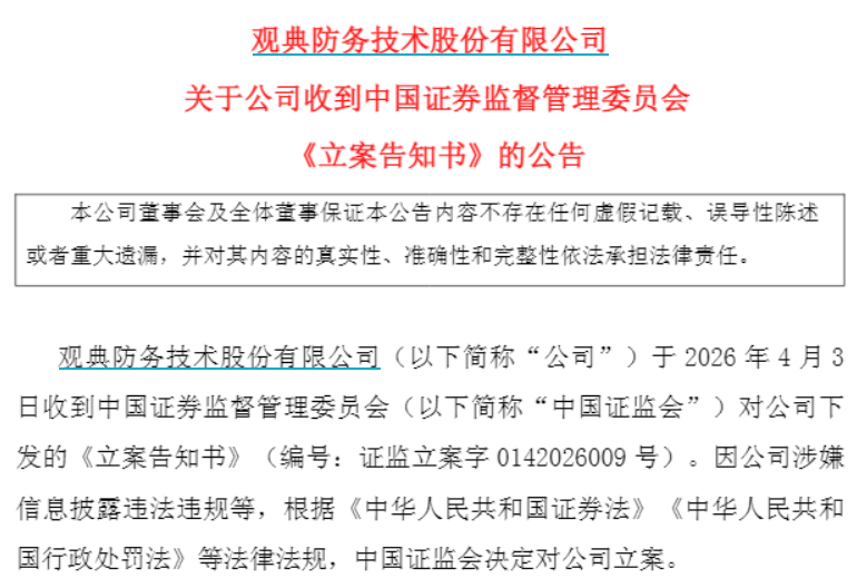 *ST观典于2026年4月3日收到中国证监会对公司下发的《立案告知书》(编号:证监立案字0142026009号)。因公司涉嫌信息披露违法违规等,根据《中华人民共和国证券法》《中华人民共和国行政处罚法》等法律法规,中国证监会决定对公司立案。