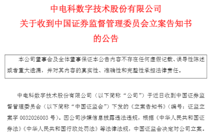 电科数字于近日收到中国证监会下发的《立案告知书》(编号:证监立案字0032026003号)。因公司涉嫌信息披露违法违规,根据《中华人民共和国证券法》《中华人民共和国行政处罚法》等法律法规,中国证监会决定对公司立案。