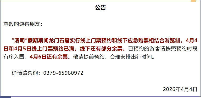 “清明”假期期间龙门石窟实行线上门票预约和线下应急购票相结合游览制。4月5日线上门票预约已满,线下还有部分余票。已预约的游客请按照预约时段有序入园。4月6日还有余票。敬请提前预约,合理安排出行时间。
