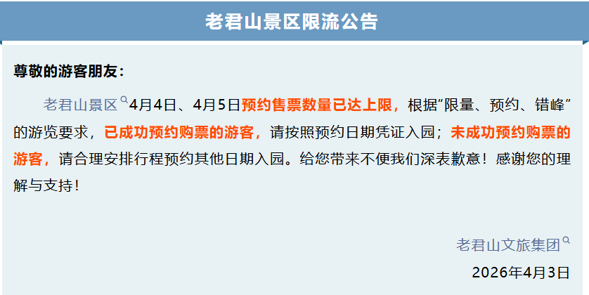 老君山景区限流公告