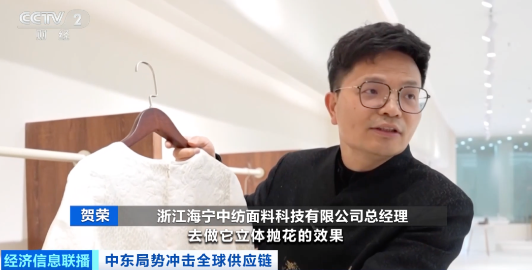 浙江海宁中纺面料科技有限公司总经理 贺荣:有的衣服会用化纤材料做立体抛花效果,一件成本上涨大概是5元到10元。如果原材料继续涨,设计师会把化纤材料直接改成人造丝。